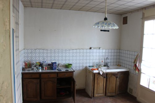 Encore du papier peint sur les murs et au plafond… on se pose encore beaucoup de questions sur cette pièce. On sait qu’on va transformer la porte-fenêtre en simple fenêtre, peut-être coulissante, et que nous devons absolument relever l’évier pour éviter de se retrouver avec le dos bloqué à chaque vaisselle. Mais pour le reste.. îlot central ou pas ? Porte coulissante avec le cellier ou pas ? Ouverture sur l’entrée ou pas ? Style bar ?