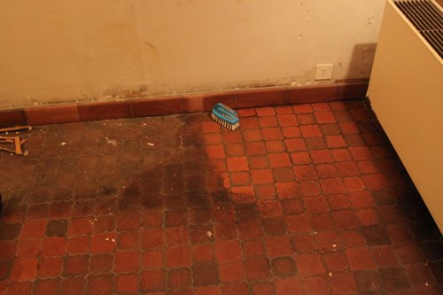Le carrelage… on le trouvait déjà beau avant, mais après le nettoyage au savon noir et une bonne couche d’huile de lin, il va être incroyable. Il nous semble que c’est de la terre cuite.